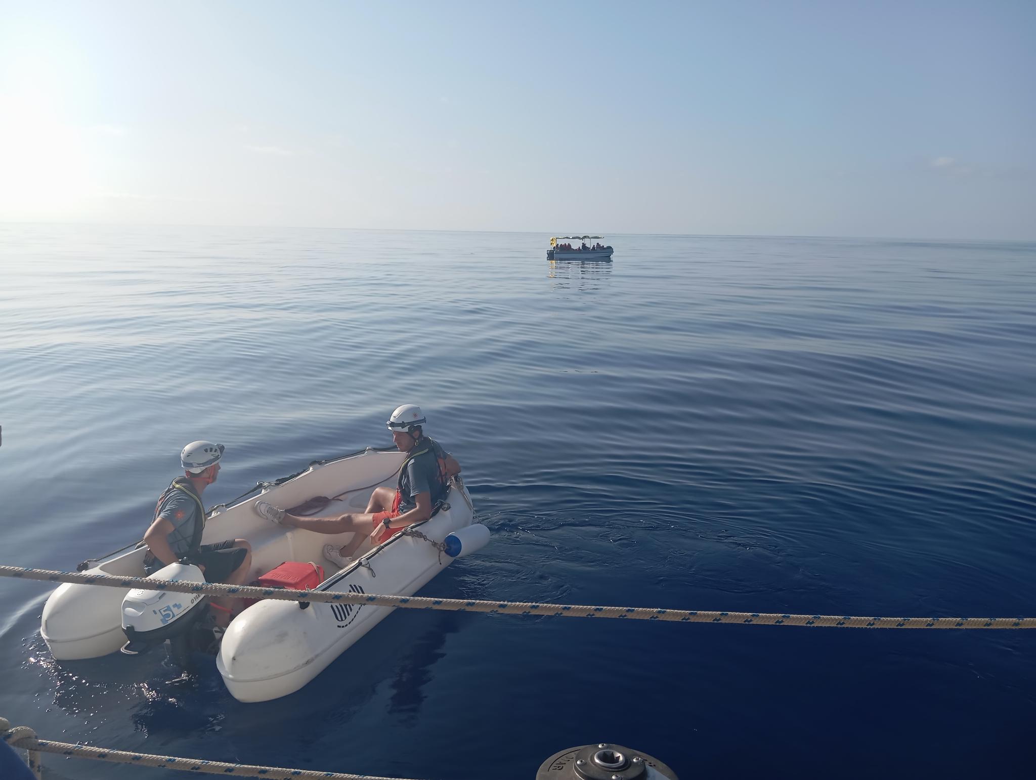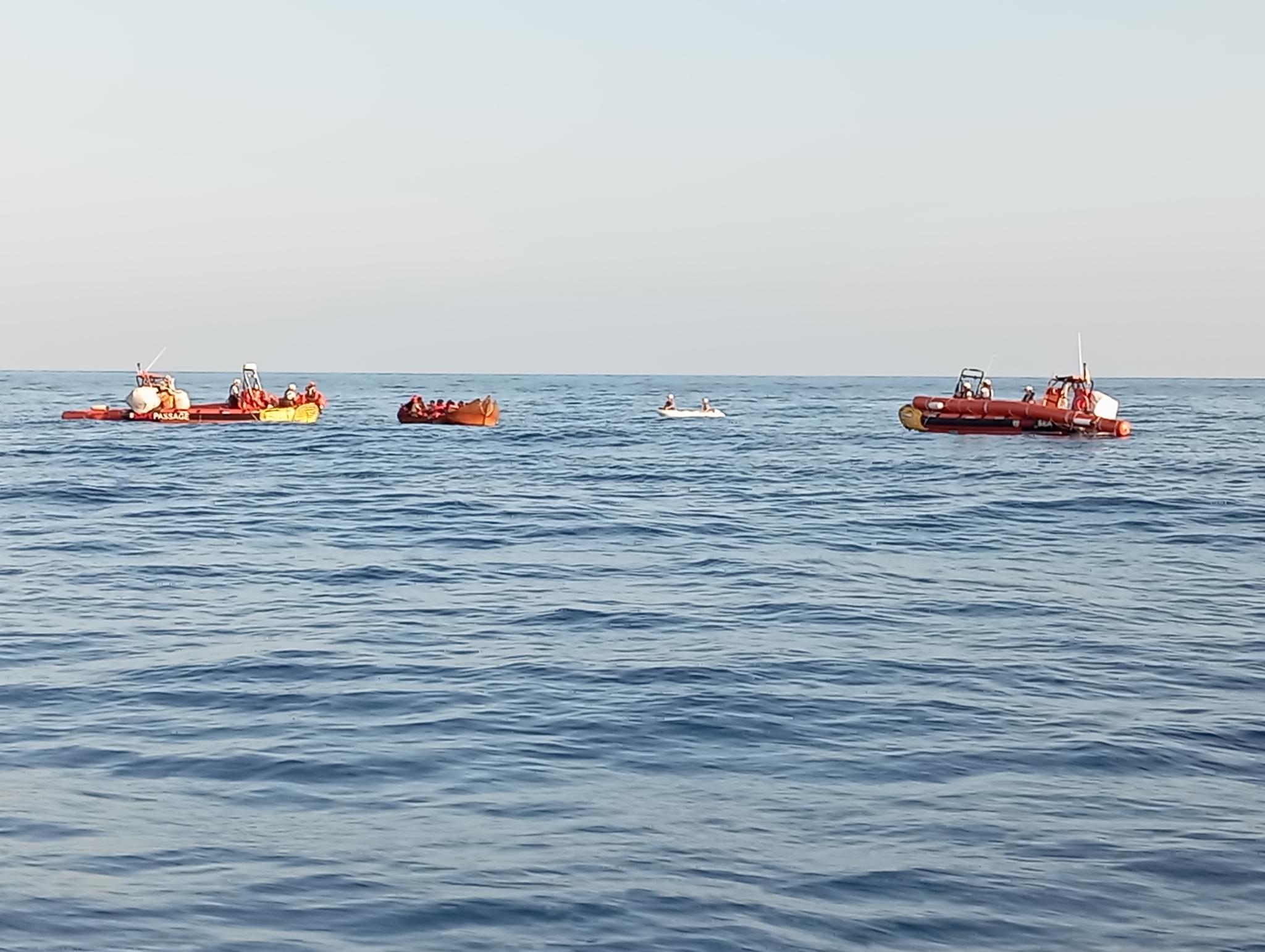 Seit den Morgenstunden assistiert die Crew der Trotamar III einem Boot in Seenot, auf das sie durch die Organisation Alarmpone aufmerksam geworden ist. Mit dem Dinghi versorgten die Crewmitglieder die 20 Menschen an Bord mit Rettungswesten, Wasser und Essen. Die Menschen harren seit zwei Tagen auf dem Wasser aus und haben immer mehr mit der