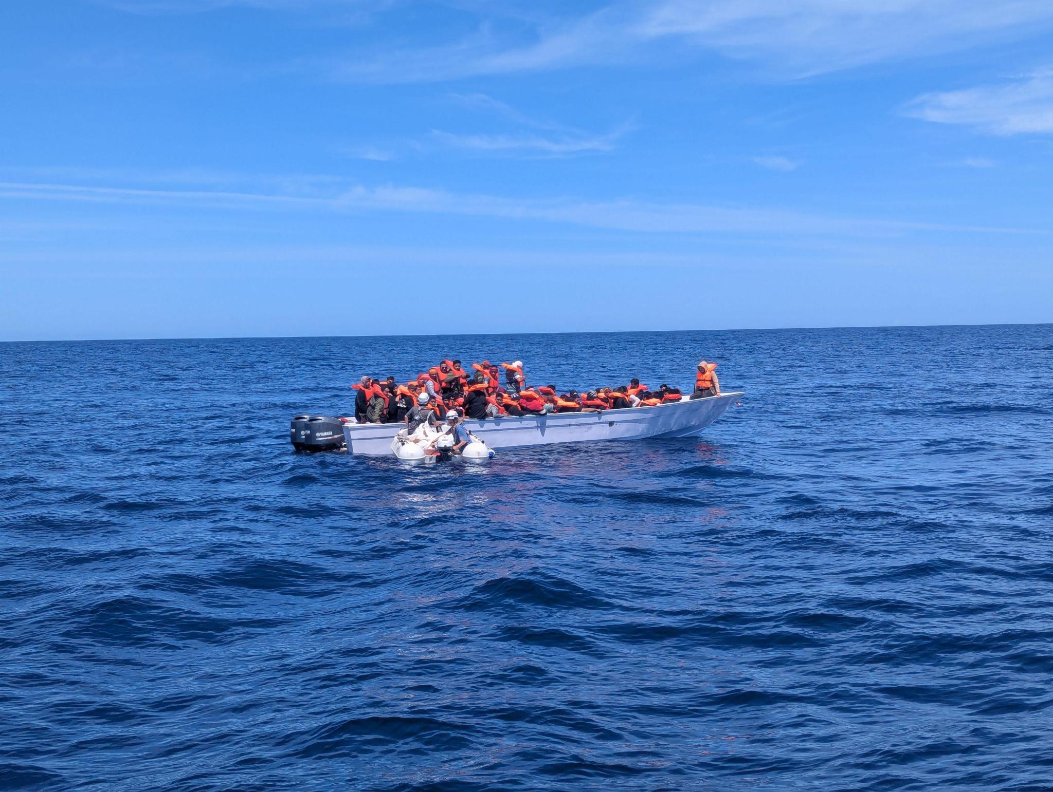 Yesterday at around 3 pm, the crew of the Trotamar III came across a boat in distress: About 60 people in a fiberglass boat with poor stability. The boat’s outboard engines are still running, but water is entering the boat and the people had no life-saving equipment on board.As quickly as possible, our dinghy crew